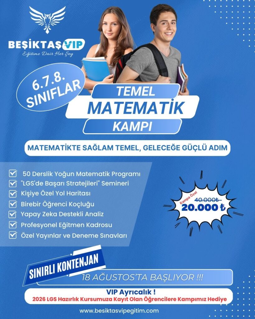 LGS’ye en güçlü başlangıcı Beşiktaş VIP Eğitim ile yapın! 6, 7 ve 8. sınıflar için özel olarak hazırlanan Temel Matematik Kampı ile eksikleri kapatın, yeni nesil sorulara hazırlanın ve özgüven kazanın. Sınırlı kontenjanı kaçırmayın!