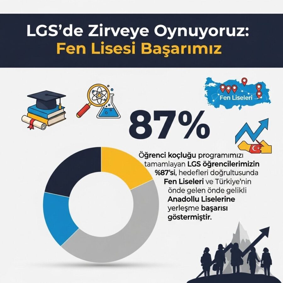 Öğrenci koçluğu programımızı tamamlayan LGS öğrencilerimizin %87'si, hedefleri doğrultusunda Fen Liseleri ve Türkiye'nin önde gelen nitelikli Anadolu Liselerine yerleşme başarısı göstermiştir.